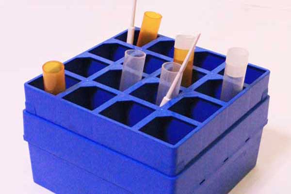 Test Tube stand for lab use. Wide Holes capable to hold different sizes. Reversible Cap that can hold base as well as be used to cover the test tubes kept in the container.